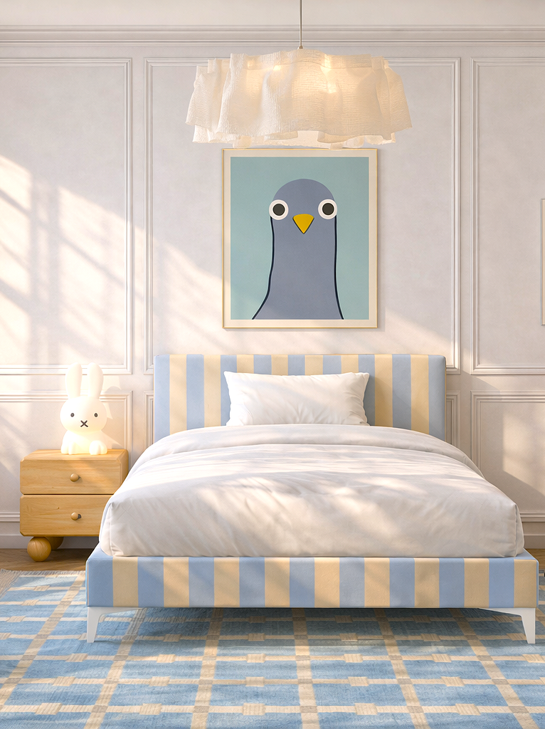 Łóżko wykonane jest z wysokiej jakości tkaniny typu velvet w pastelowe pasy. Materiał jest miękki, przyjemny w dotyku oraz odporny na codzienne użytkowanie.