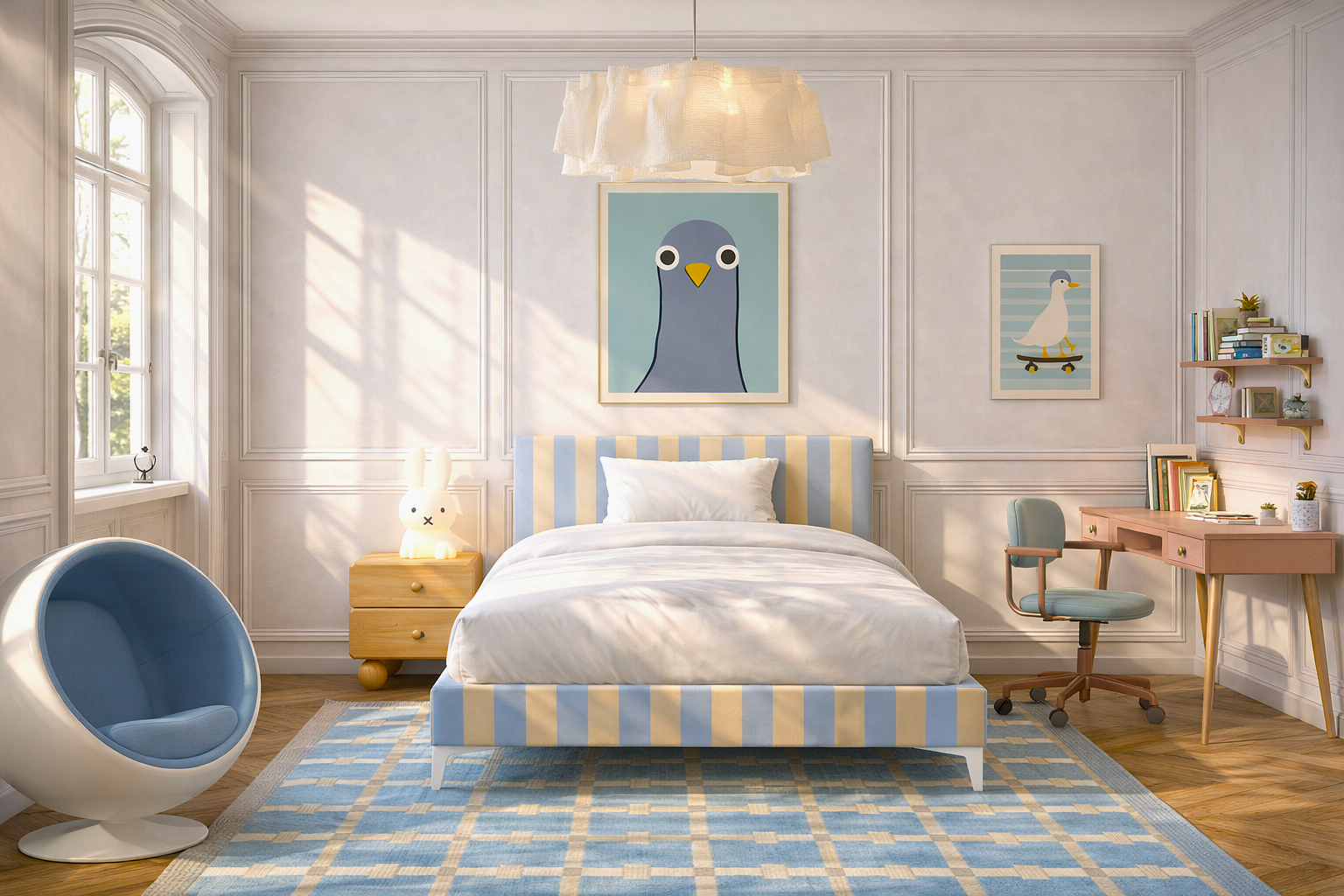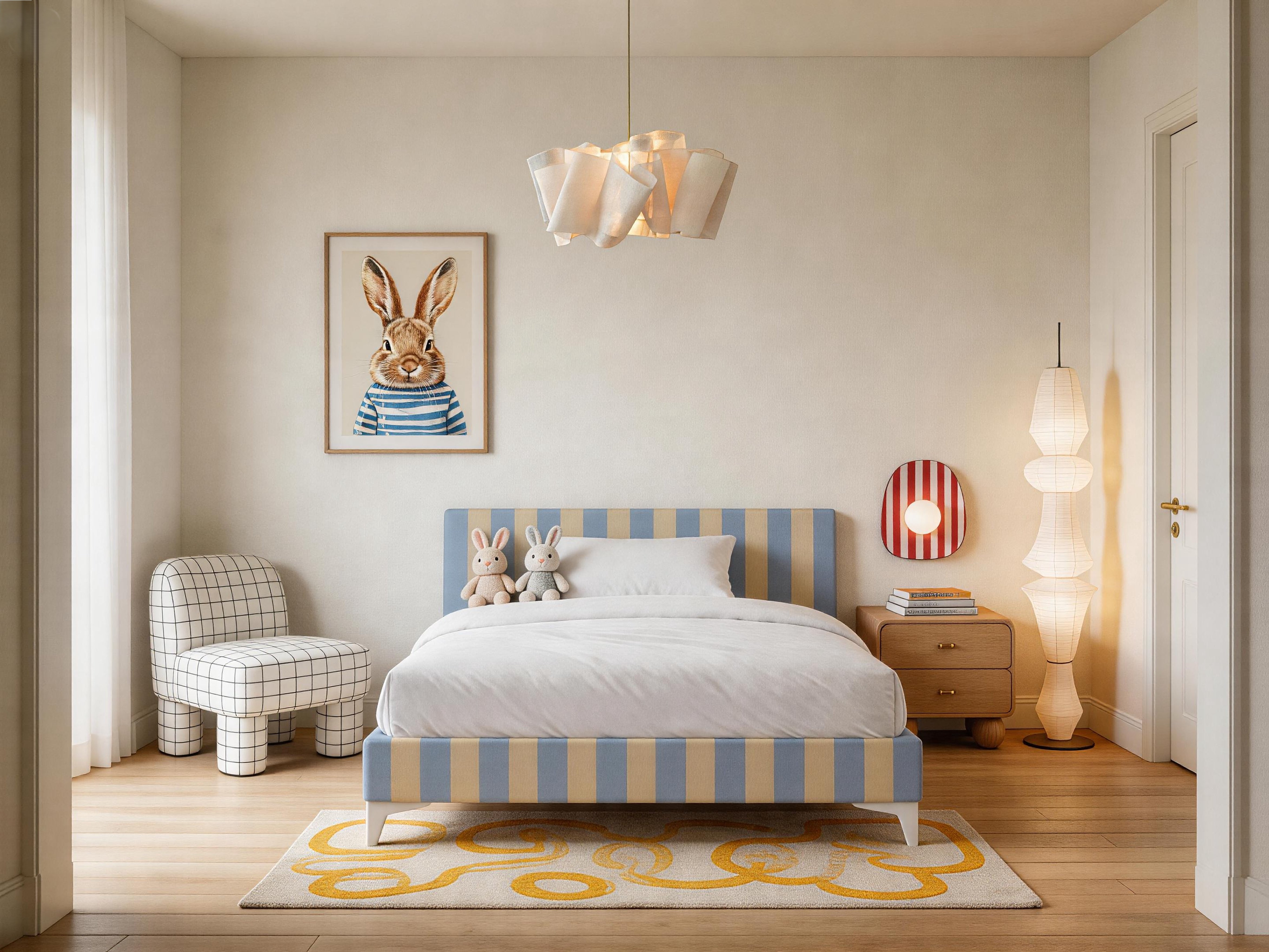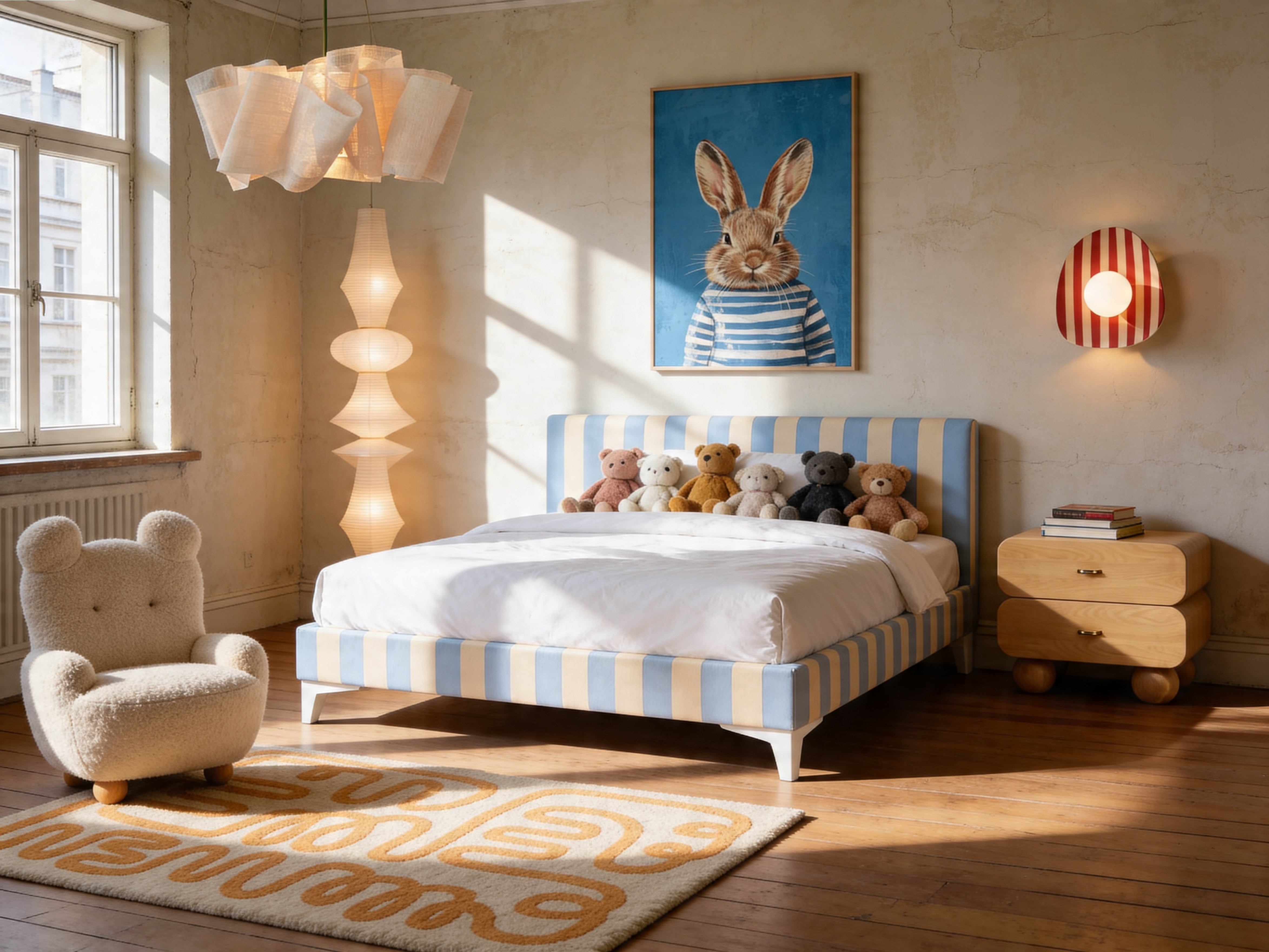 To autorska kolekcja Katarzyny Jasyk, inspirowana cukierkowymi odcieniami oraz rytmicznym układem pionowych pasów. Łóżko stanowi centralny punkt wnętrza, łącząc funkcjonalność z wyrazistą, ale subtelną estetyką.