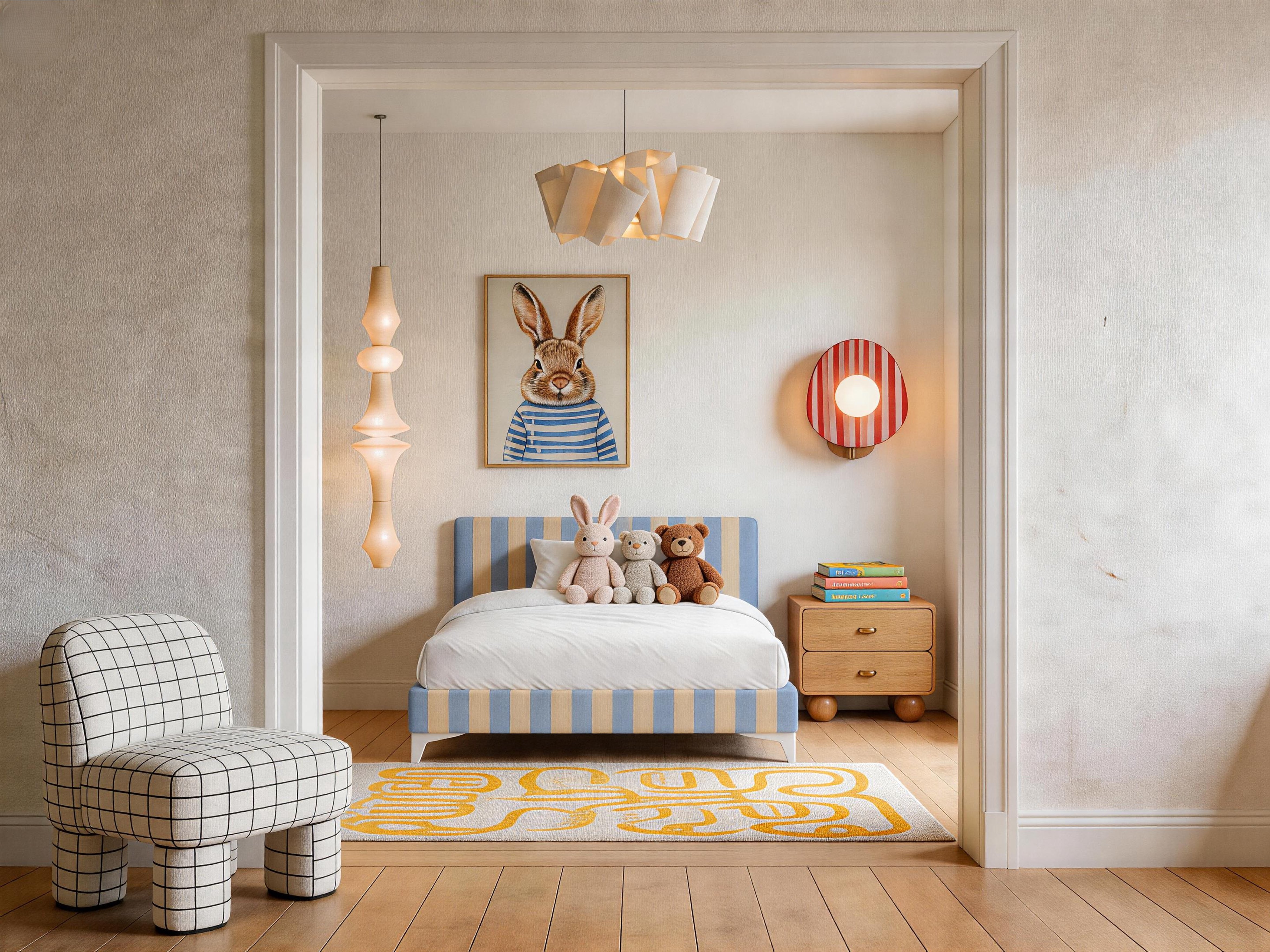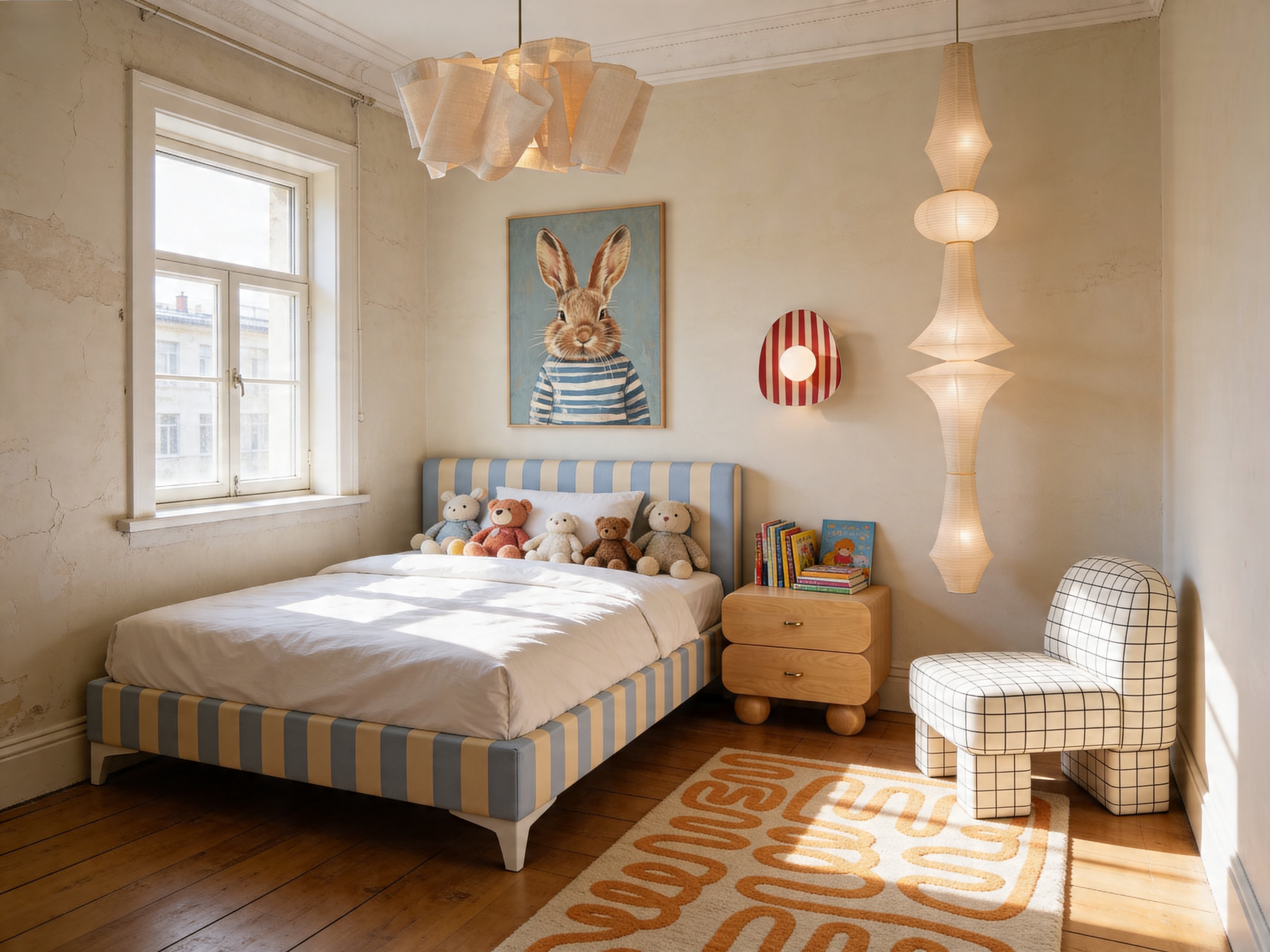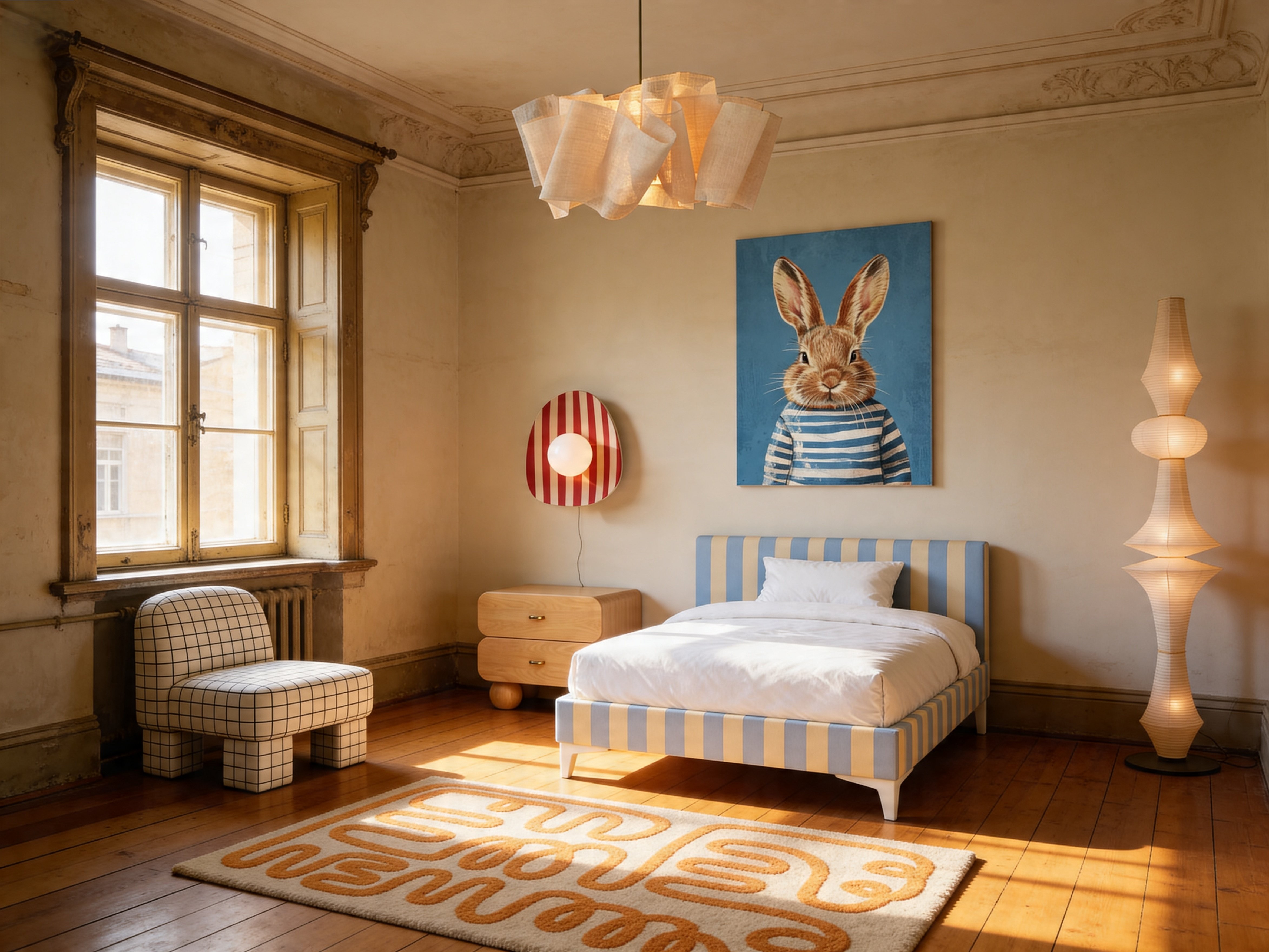 To autorska kolekcja Katarzyny Jasyk, inspirowana cukierkowymi odcieniami oraz rytmicznym układem pionowych pasów. Łóżko stanowi centralny punkt wnętrza, łącząc funkcjonalność z wyrazistą, ale subtelną estetyką.