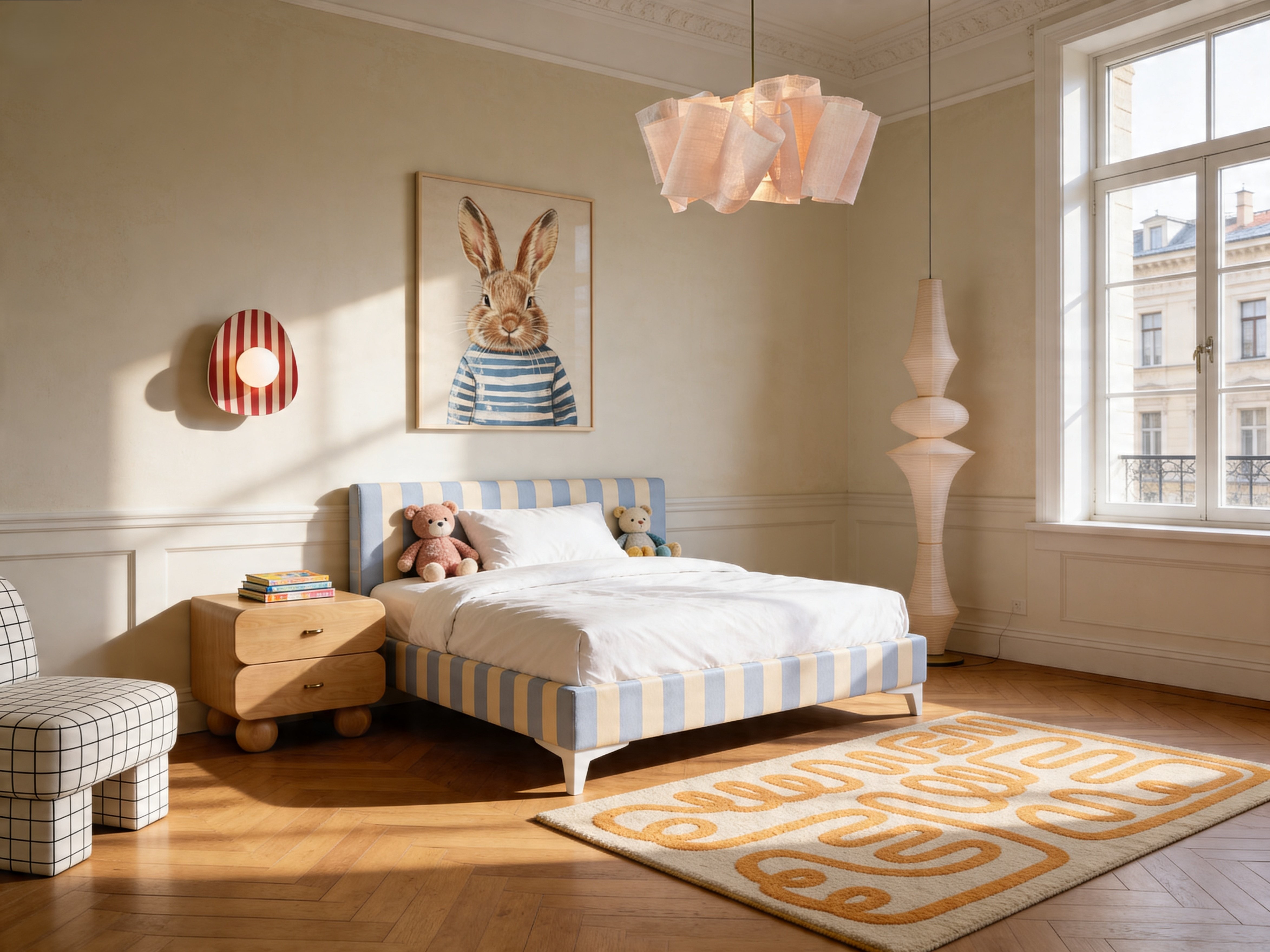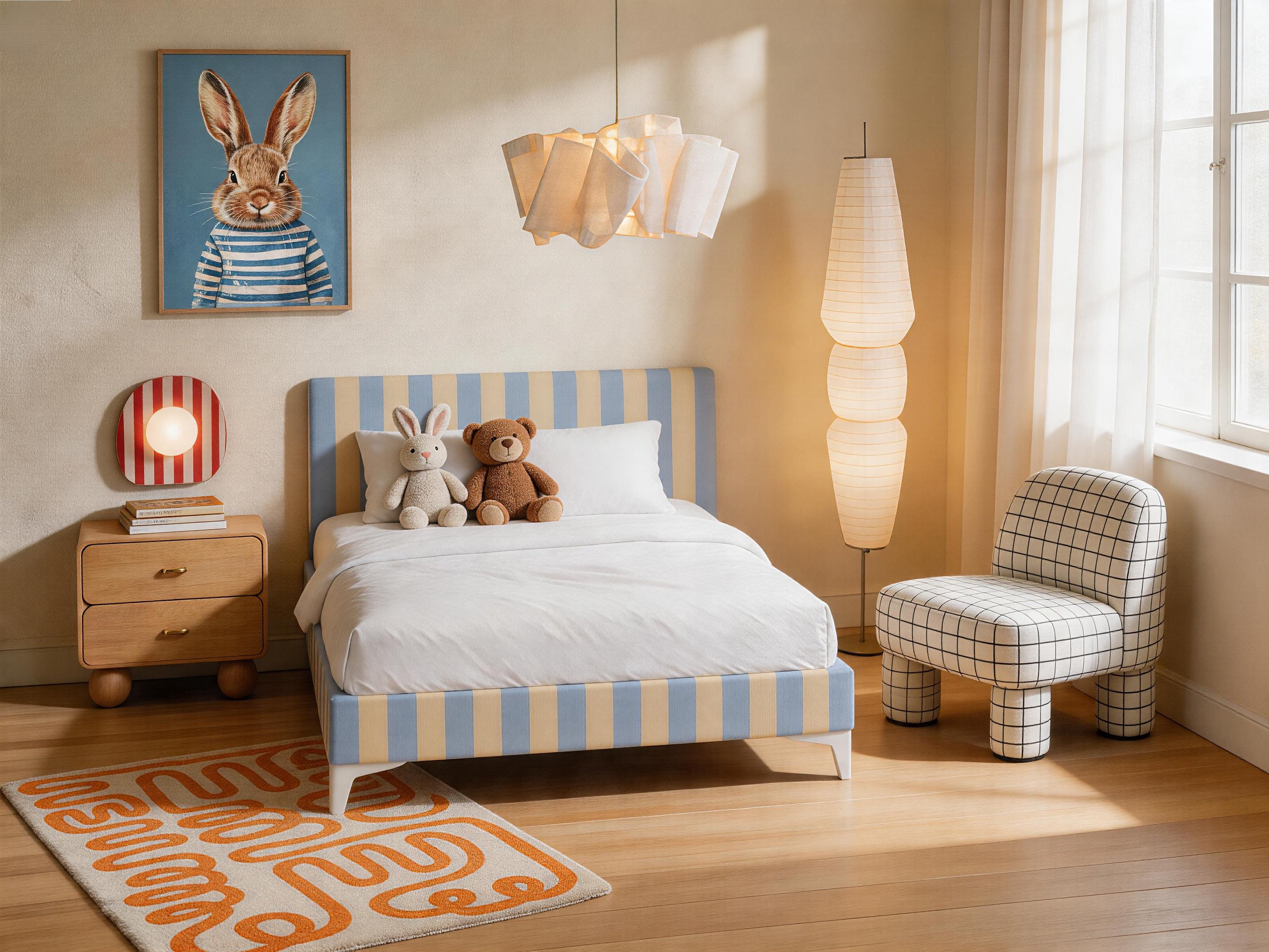 Subtelne, pastelowe pasy i miękka forma tworzą łóżko dziecięce, które buduje spokojną, przytulną przestrzeń dla dziecka.