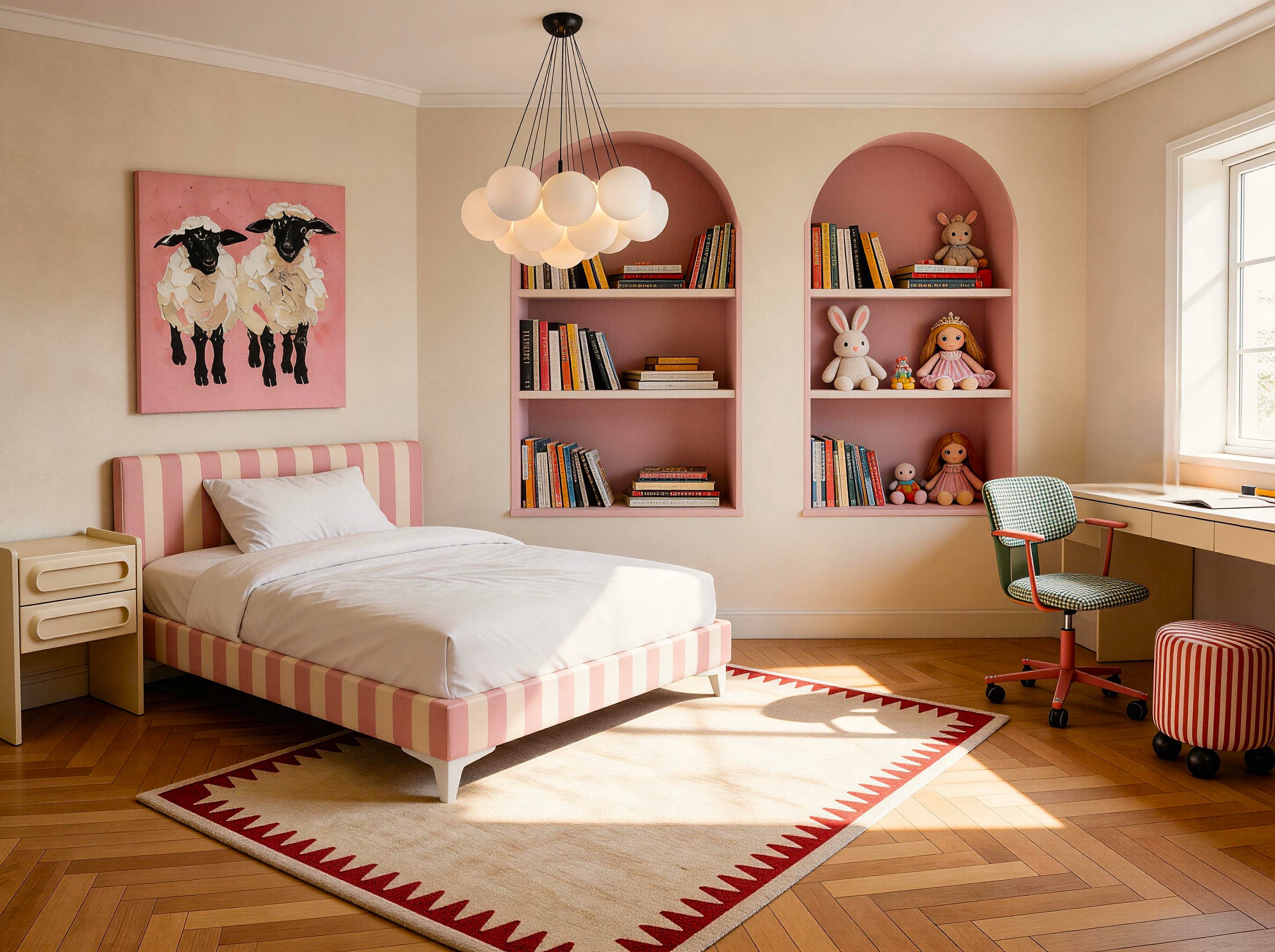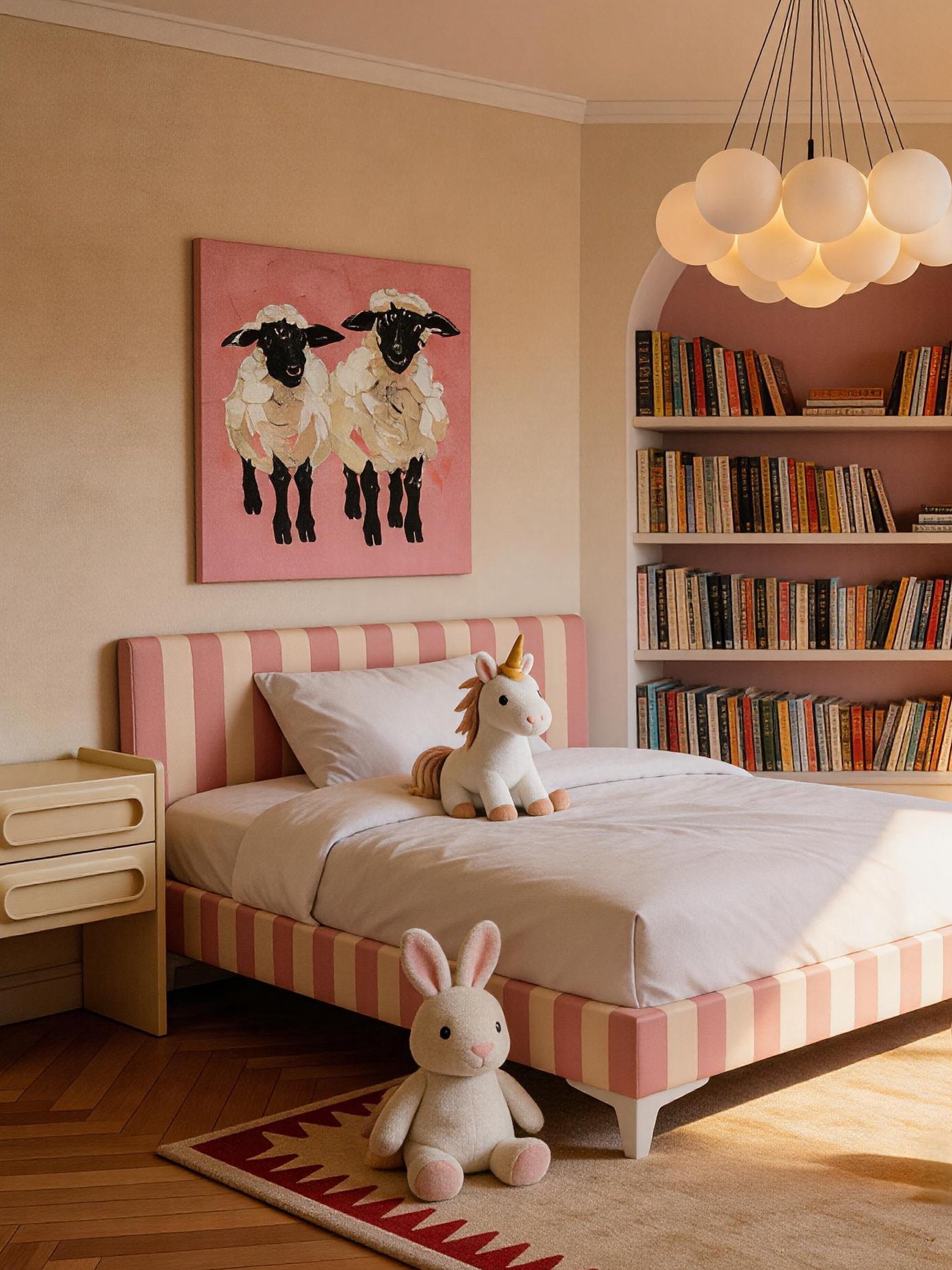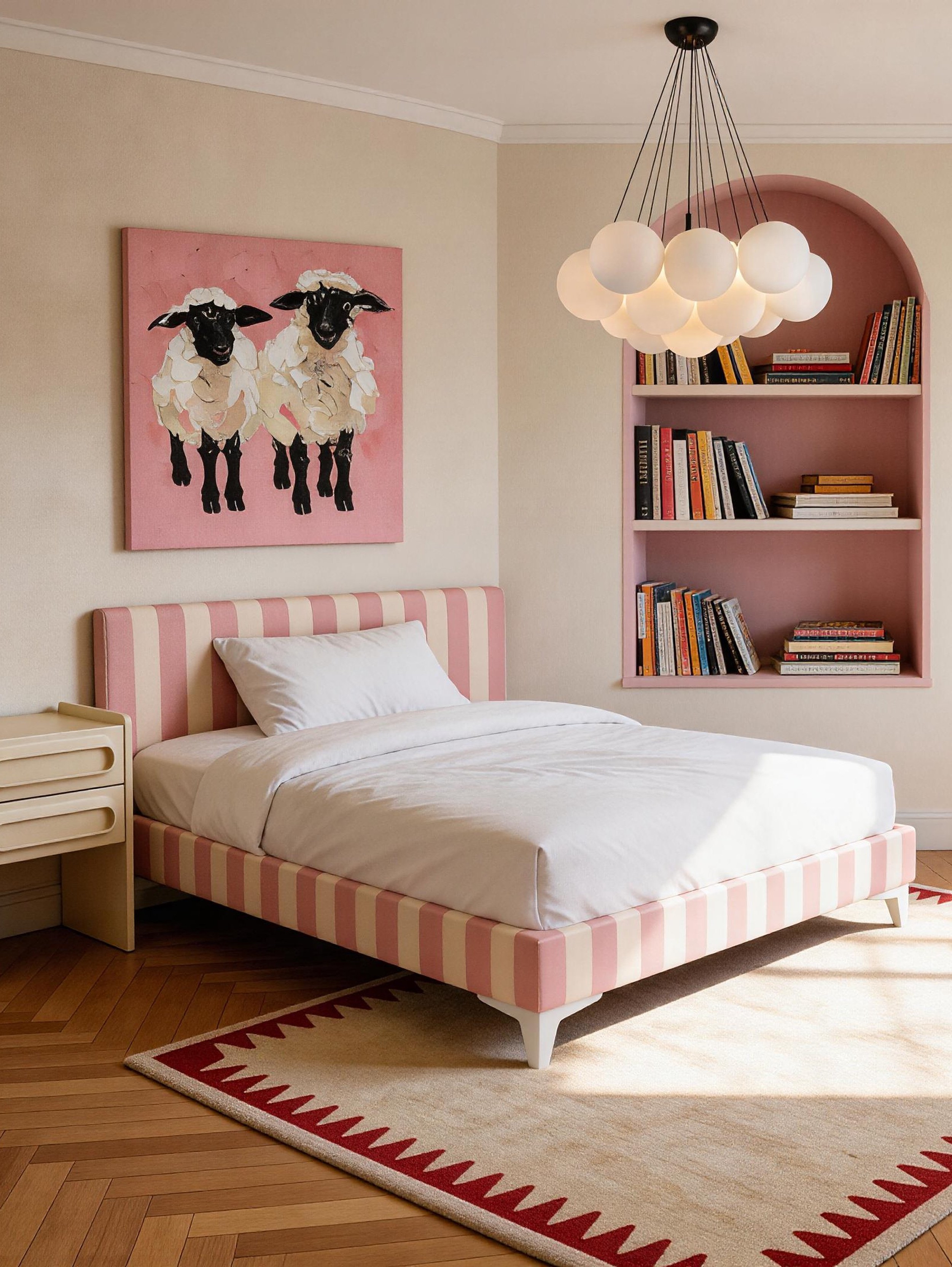 To autorska kolekcja Katarzyny Jasyk, inspirowana cukierkowymi odcieniami oraz rytmicznym układem pionowych pasów. Łóżko stanowi centralny punkt wnętrza, łącząc funkcjonalność z wyrazistą, ale subtelną estetyką.