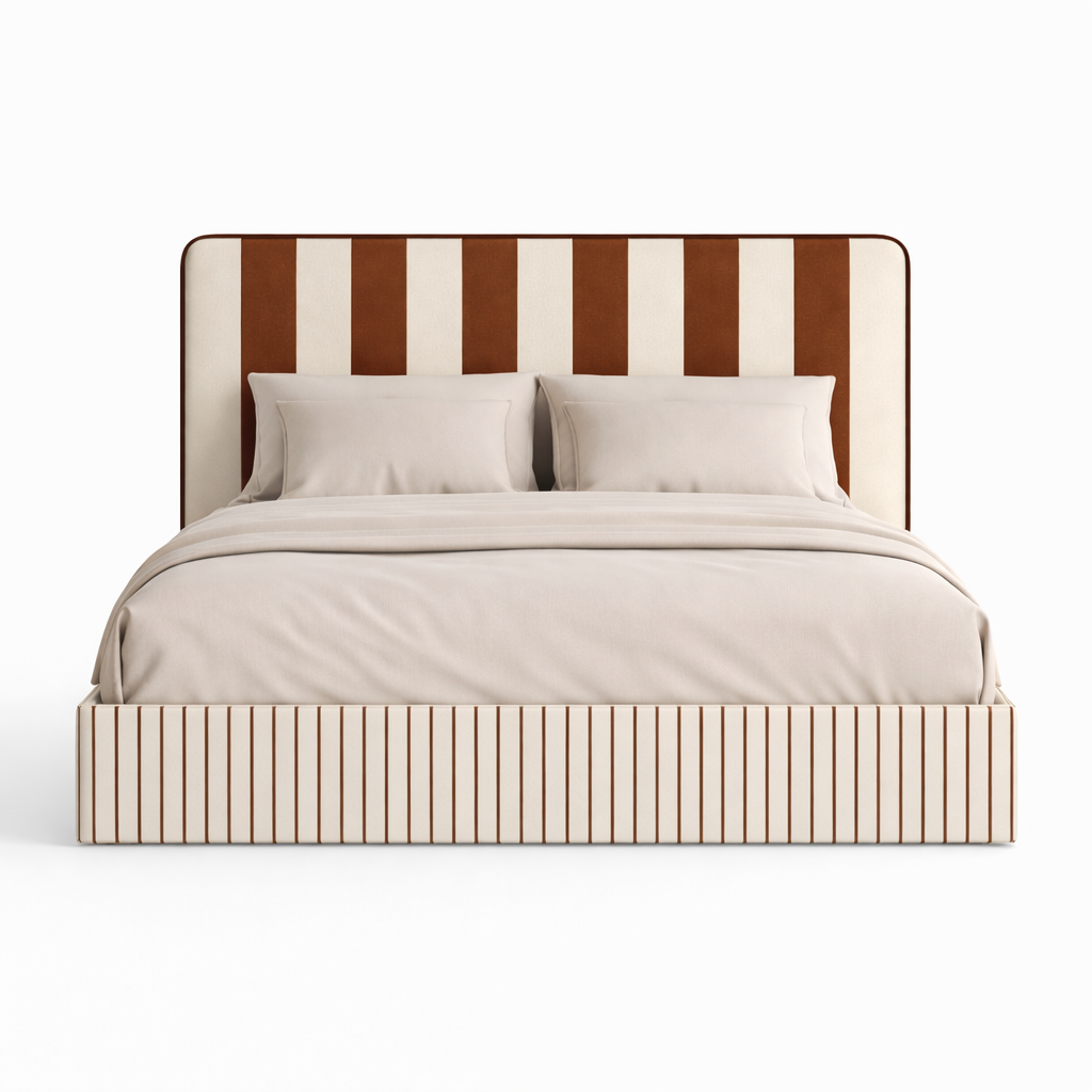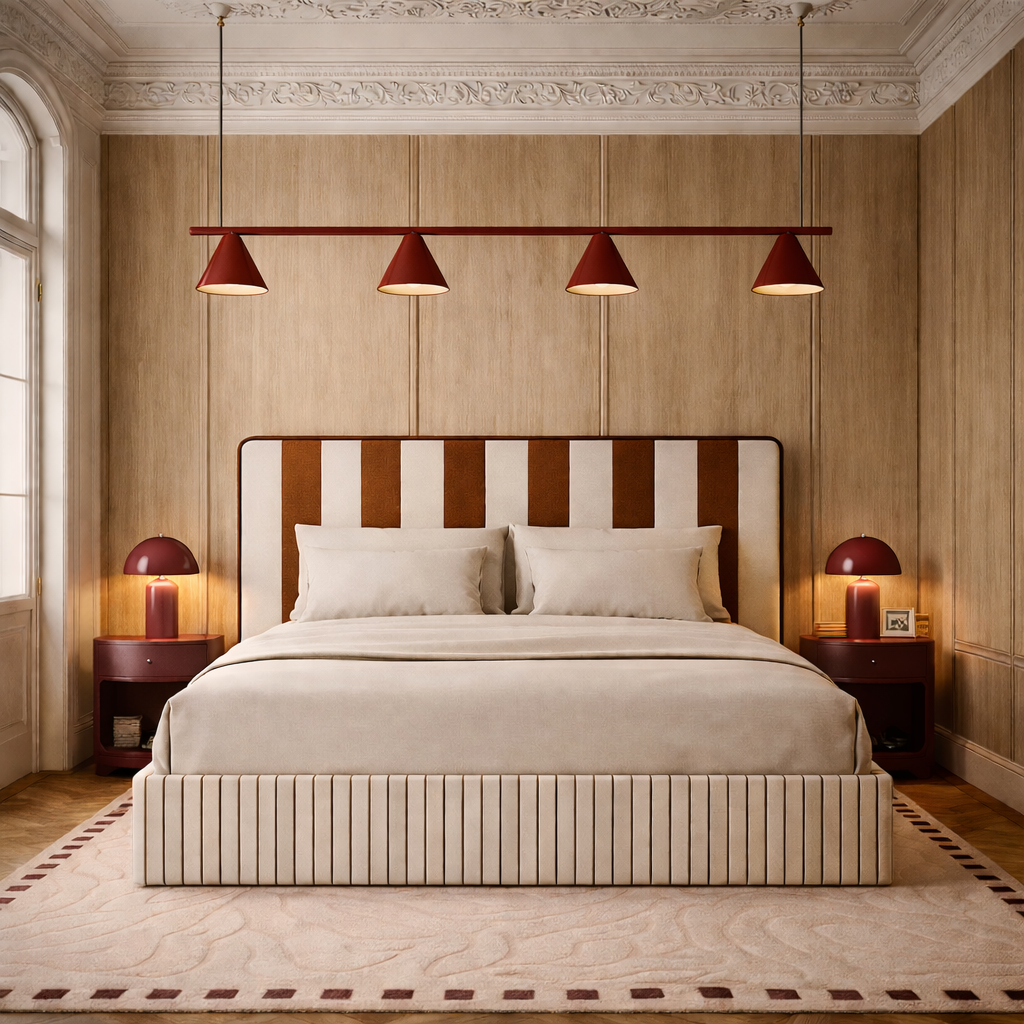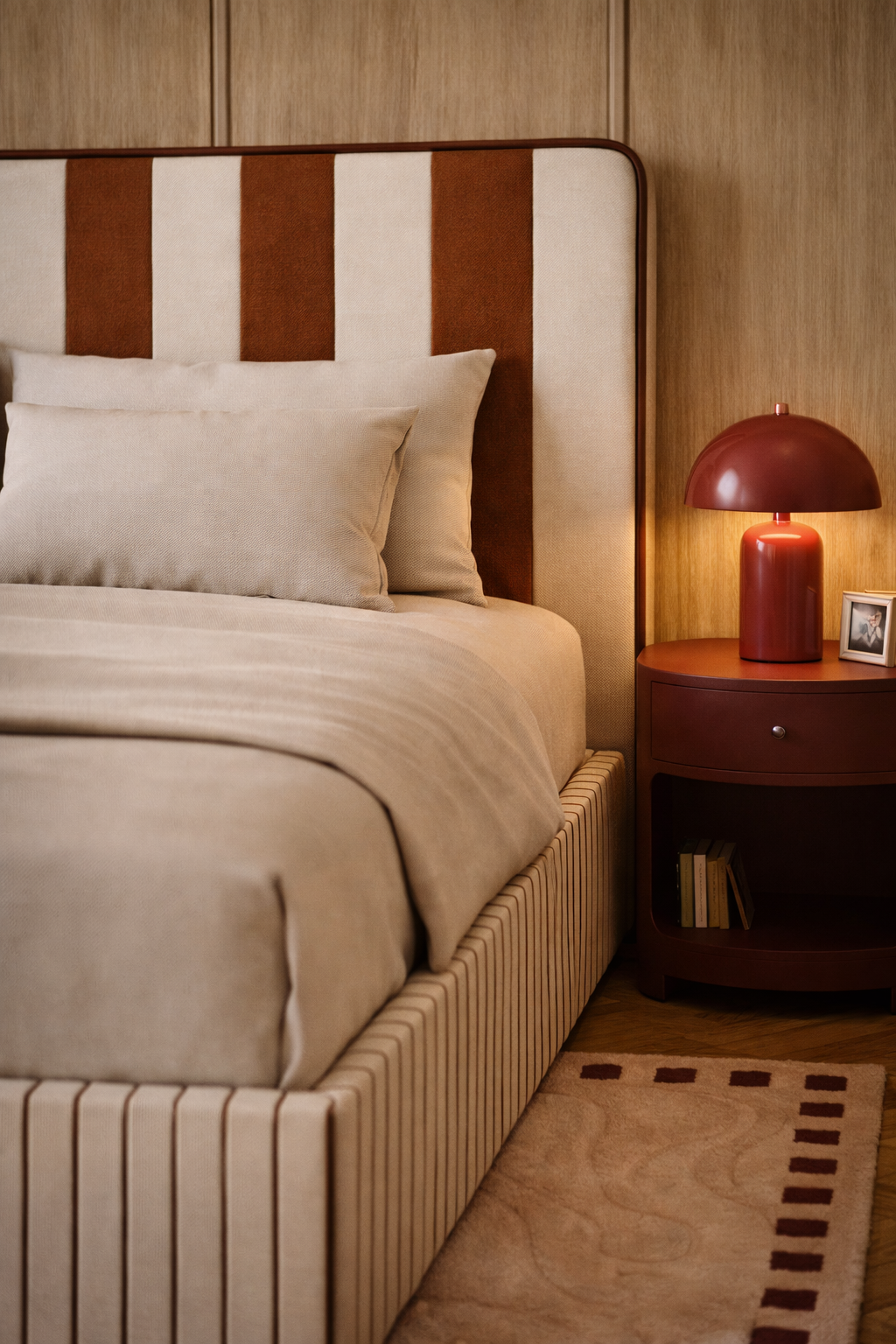 Łóżko DISSONANCE projektu Katarzyny Jasyk to połączenie wyrazistego designu z codzienną funkcjonalnością. Charakterystyczne zestawienia kolorów i pasów tworzą unikalny efekt, który nadaje wnętrzu indywidualny styl i przyciąga uwagę.
