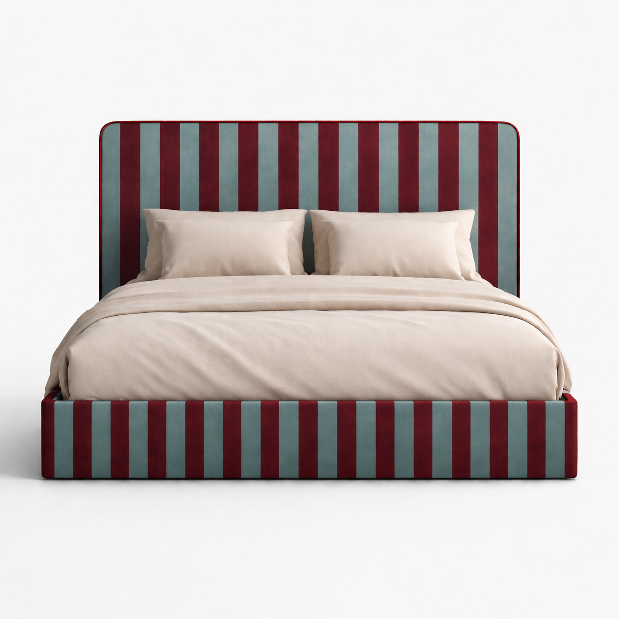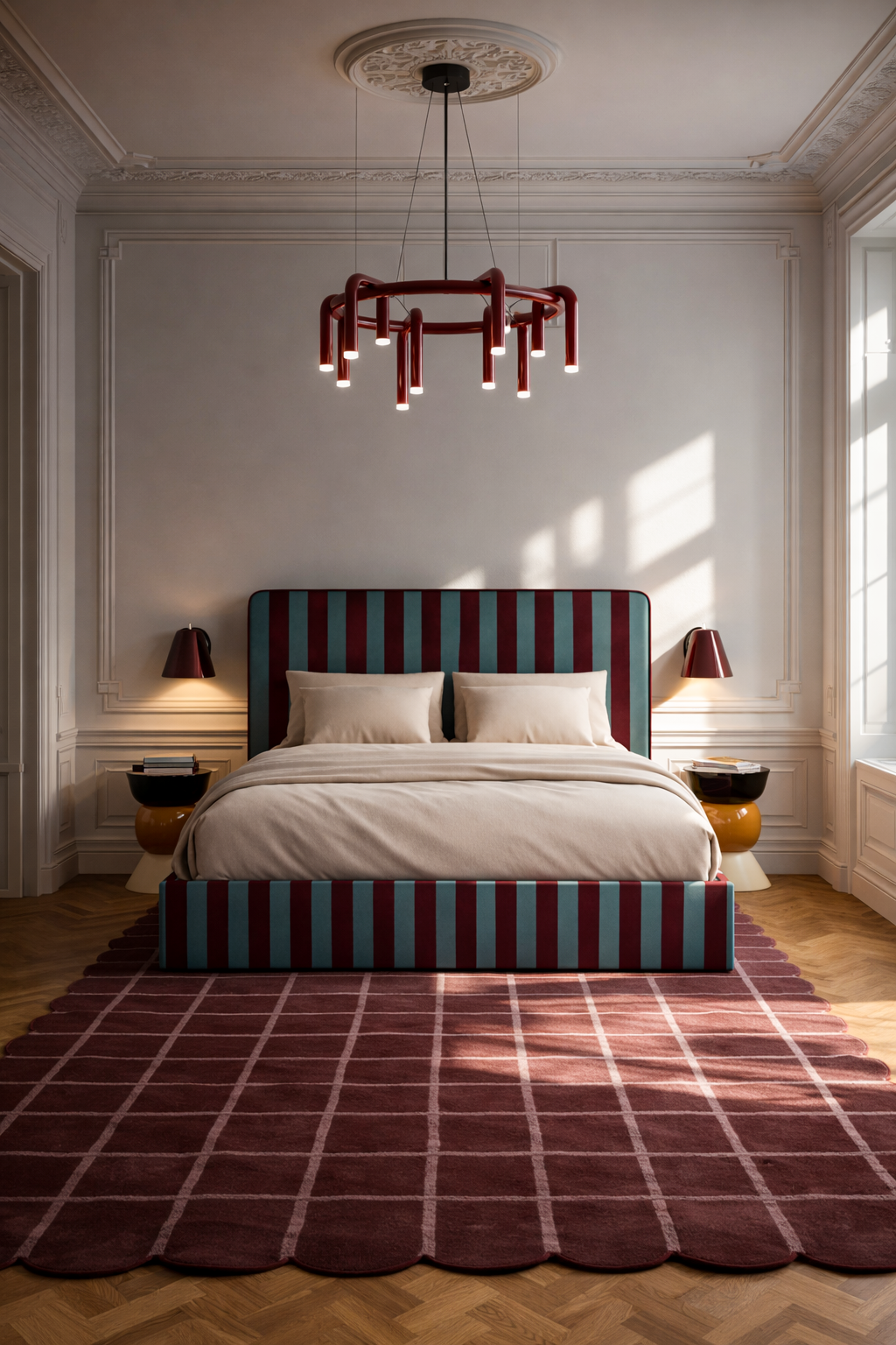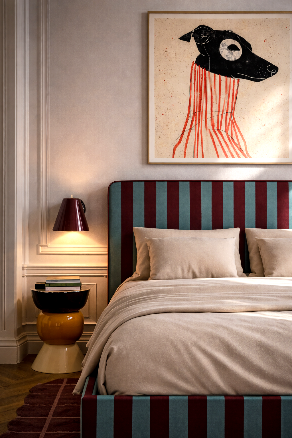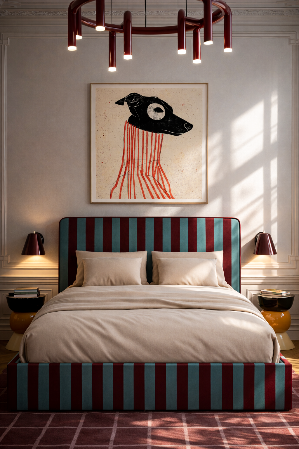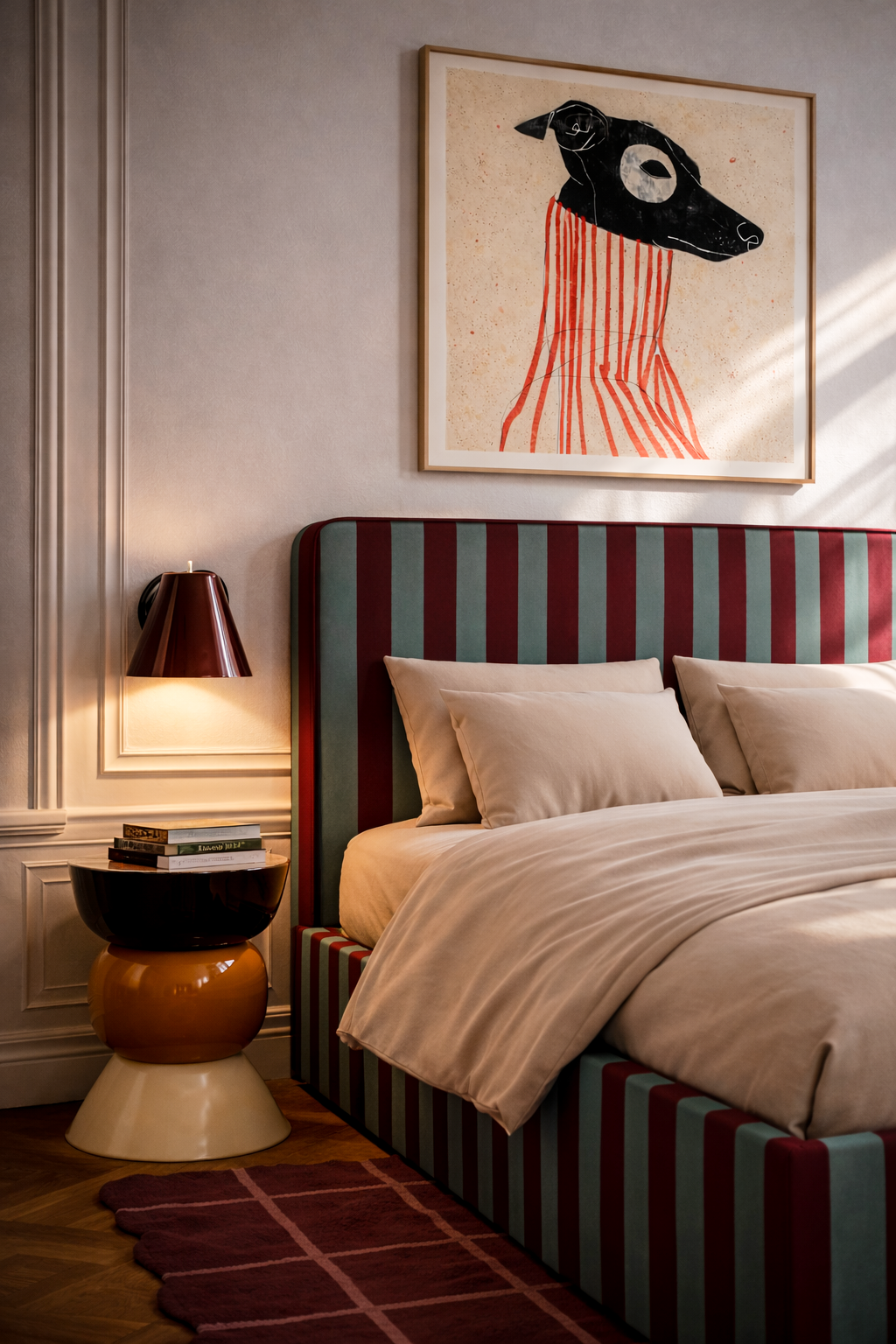Łóżko DISSONANCE projektu Katarzyny Jasyk to połączenie wyrazistego designu z codzienną funkcjonalnością. Charakterystyczne zestawienia kolorów i pasów tworzą unikalny efekt, który nadaje wnętrzu indywidualny styl i przyciąga uwagę.