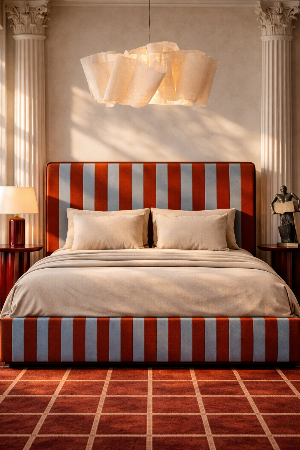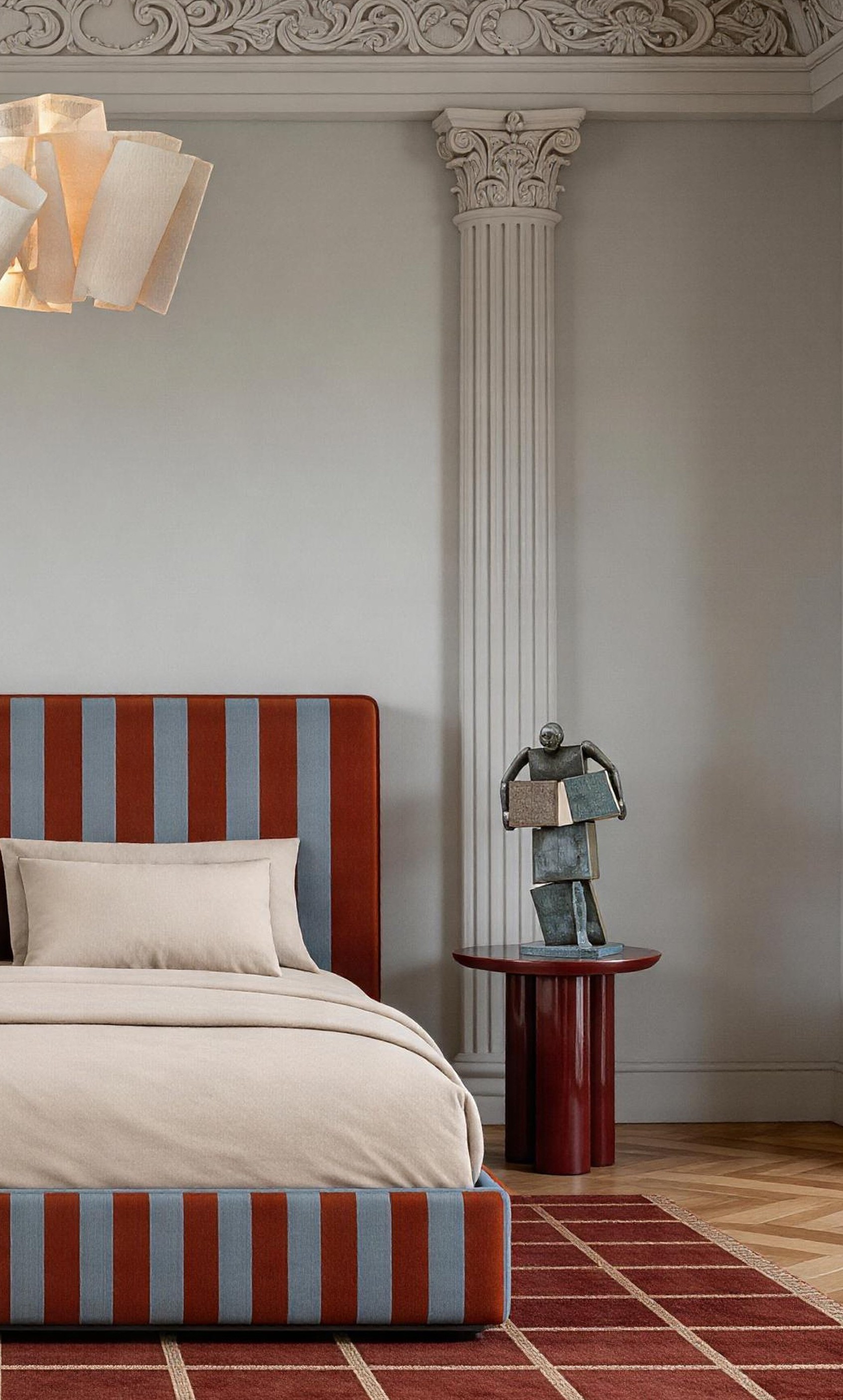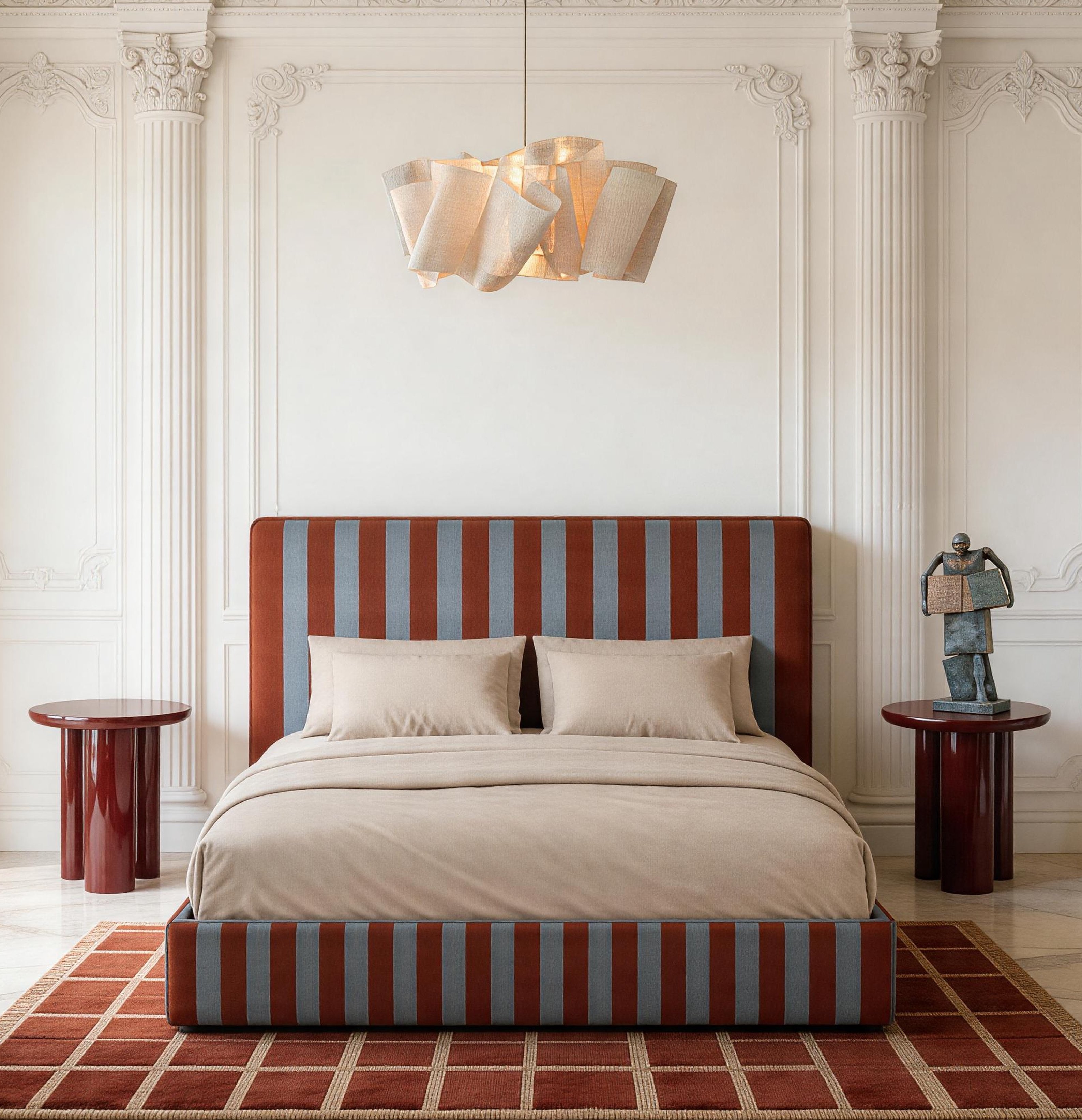 Łóżko DISSONANCE projektu Katarzyny Jasyk to połączenie wyrazistego designu z codzienną funkcjonalnością. Charakterystyczne zestawienia kolorów i pasów tworzą unikalny efekt, który nadaje wnętrzu indywidualny styl i przyciąga uwagę.