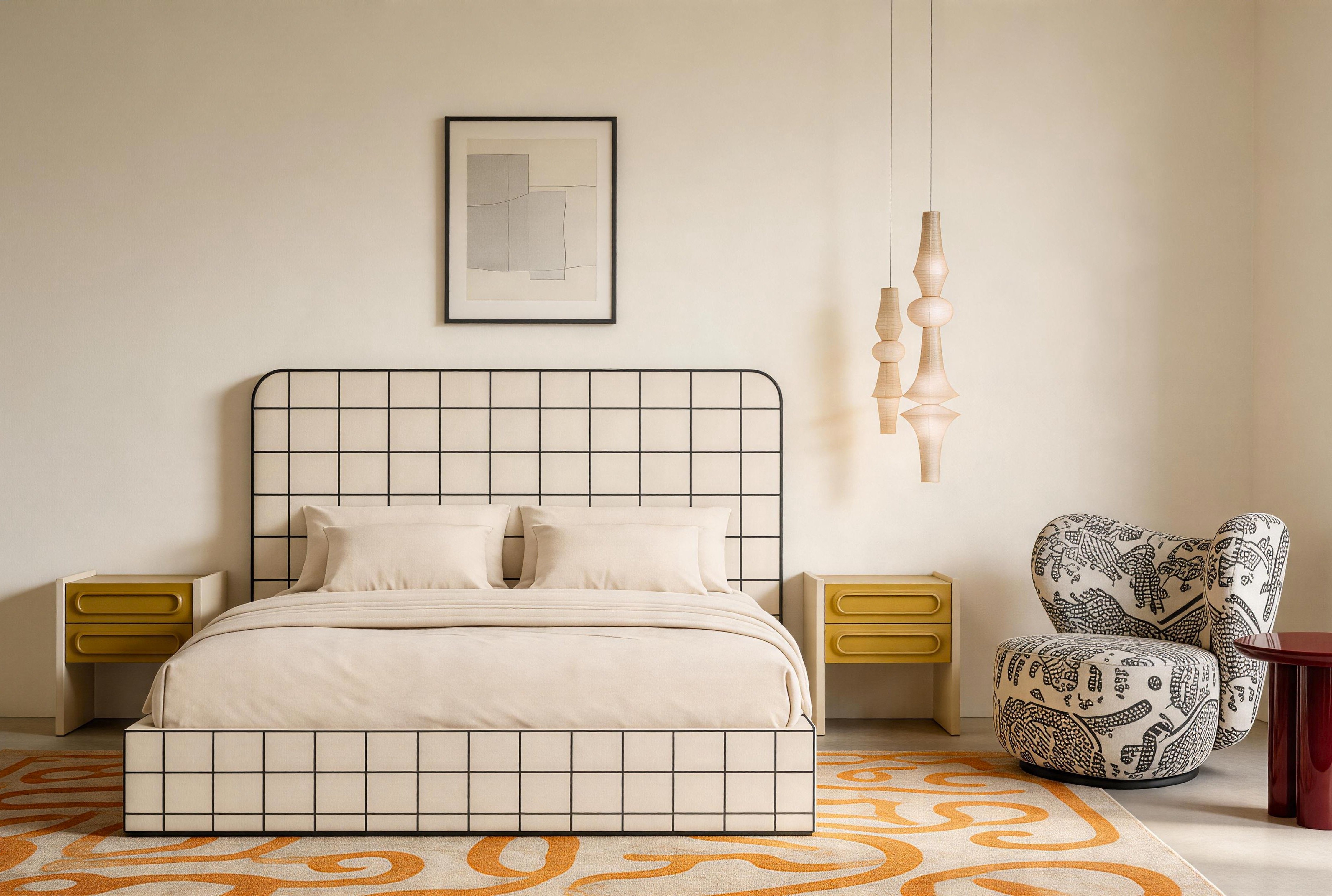 Łóżko DISSONANCE projektu Katarzyny Jasyk to połączenie wyrazistego designu z codzienną funkcjonalnością. Charakterystyczne zestawienia kolorów i pasów tworzą unikalny efekt, który nadaje wnętrzu indywidualny styl i przyciąga uwagę.