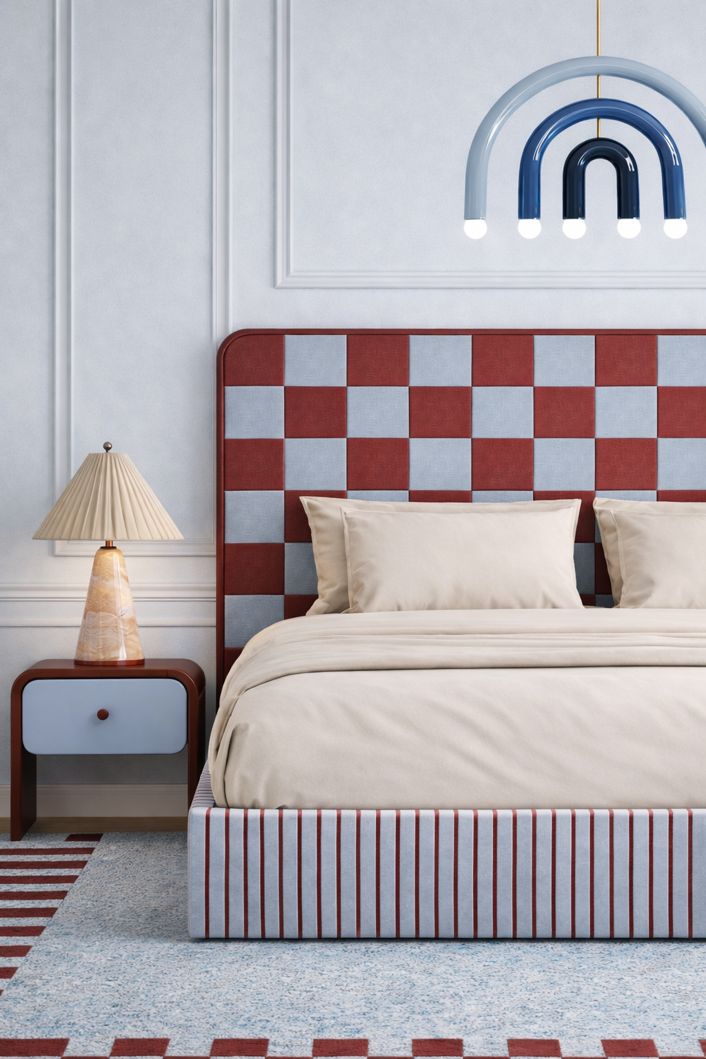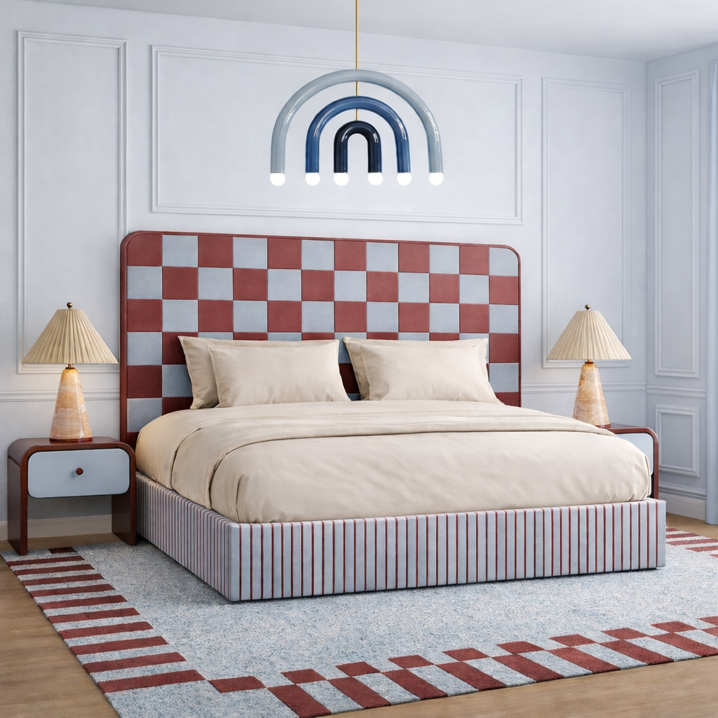 Łóżko DISSONANCE projektu Katarzyny Jasyk to połączenie wyrazistego designu z codzienną funkcjonalnością. Charakterystyczne zestawienia kolorów i pasów tworzą unikalny efekt, który nadaje wnętrzu indywidualny styl i przyciąga uwagę.