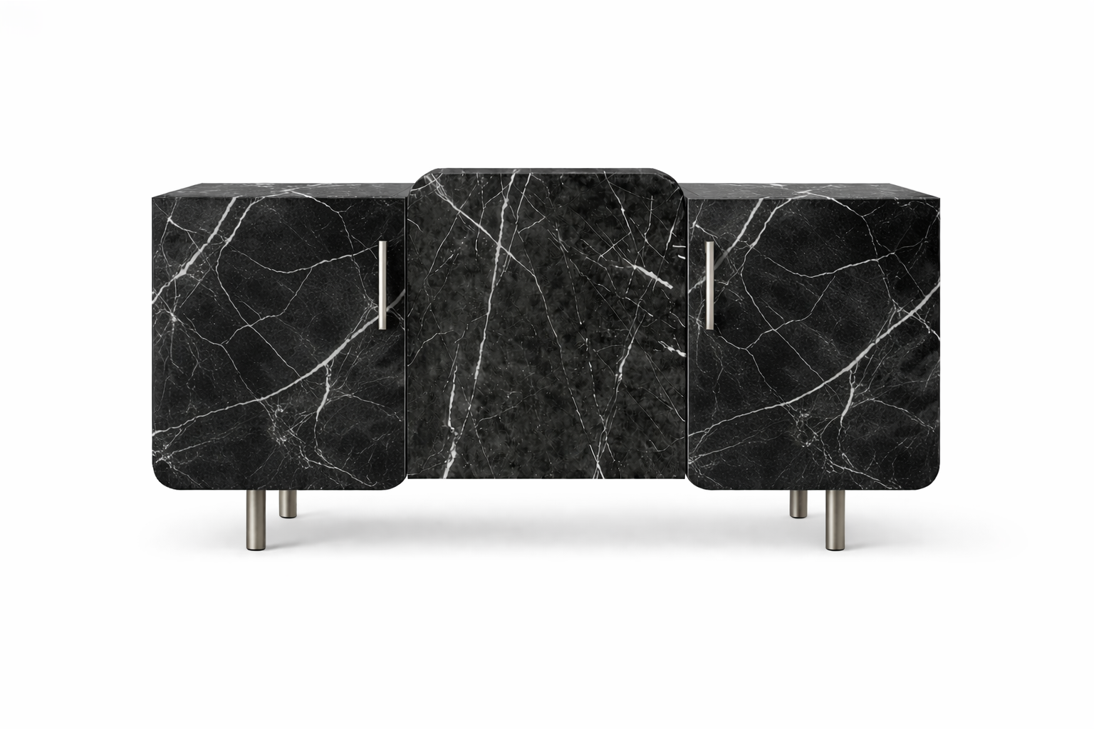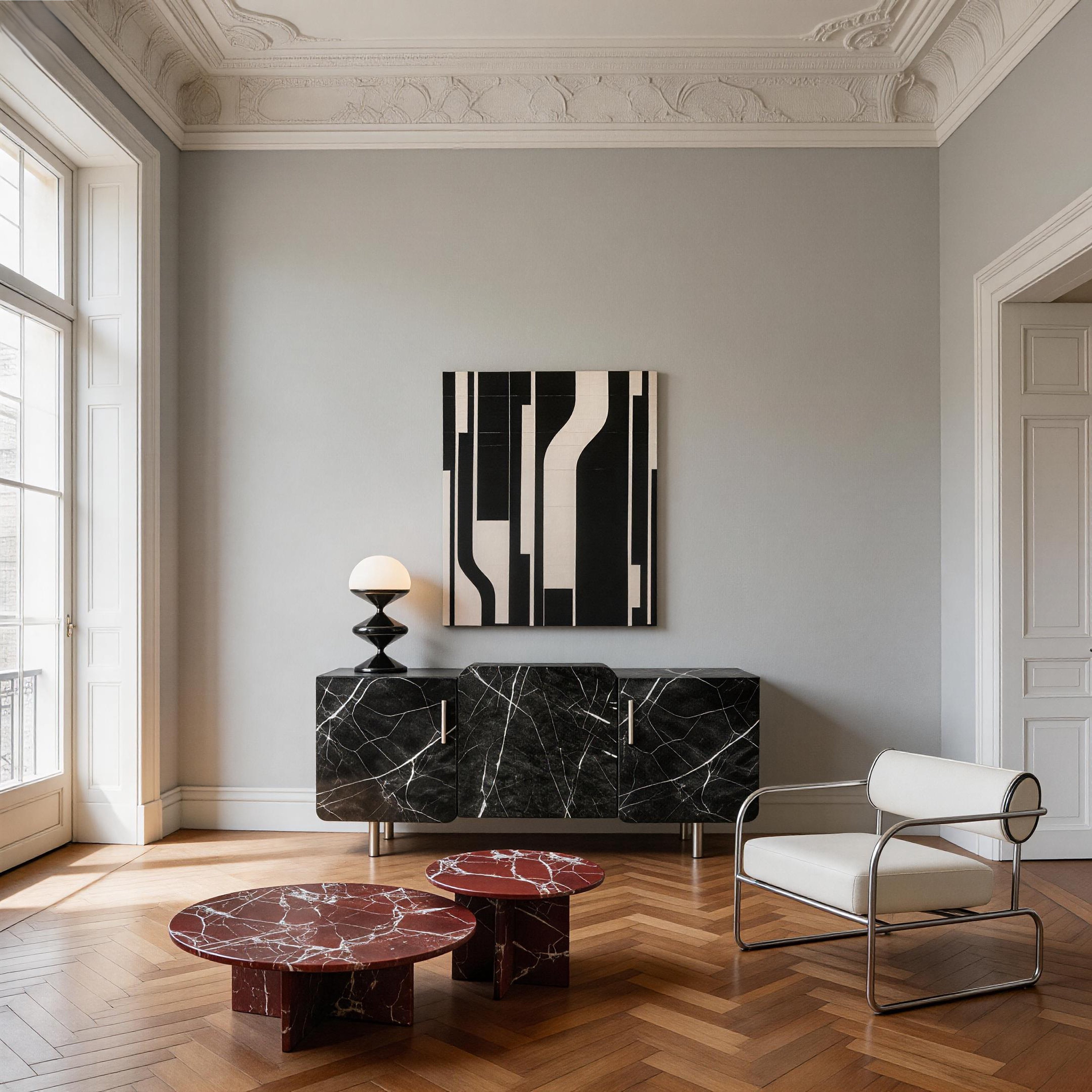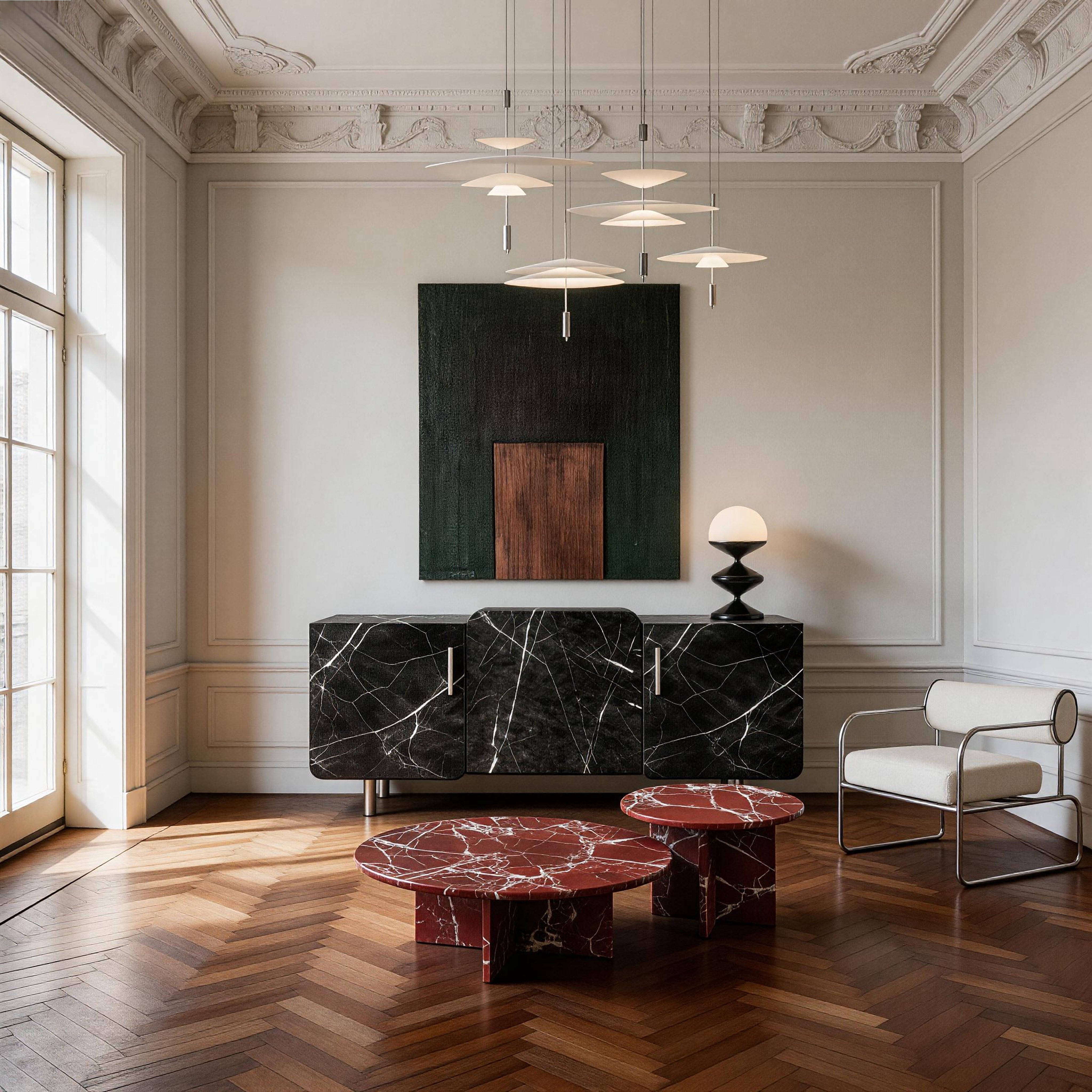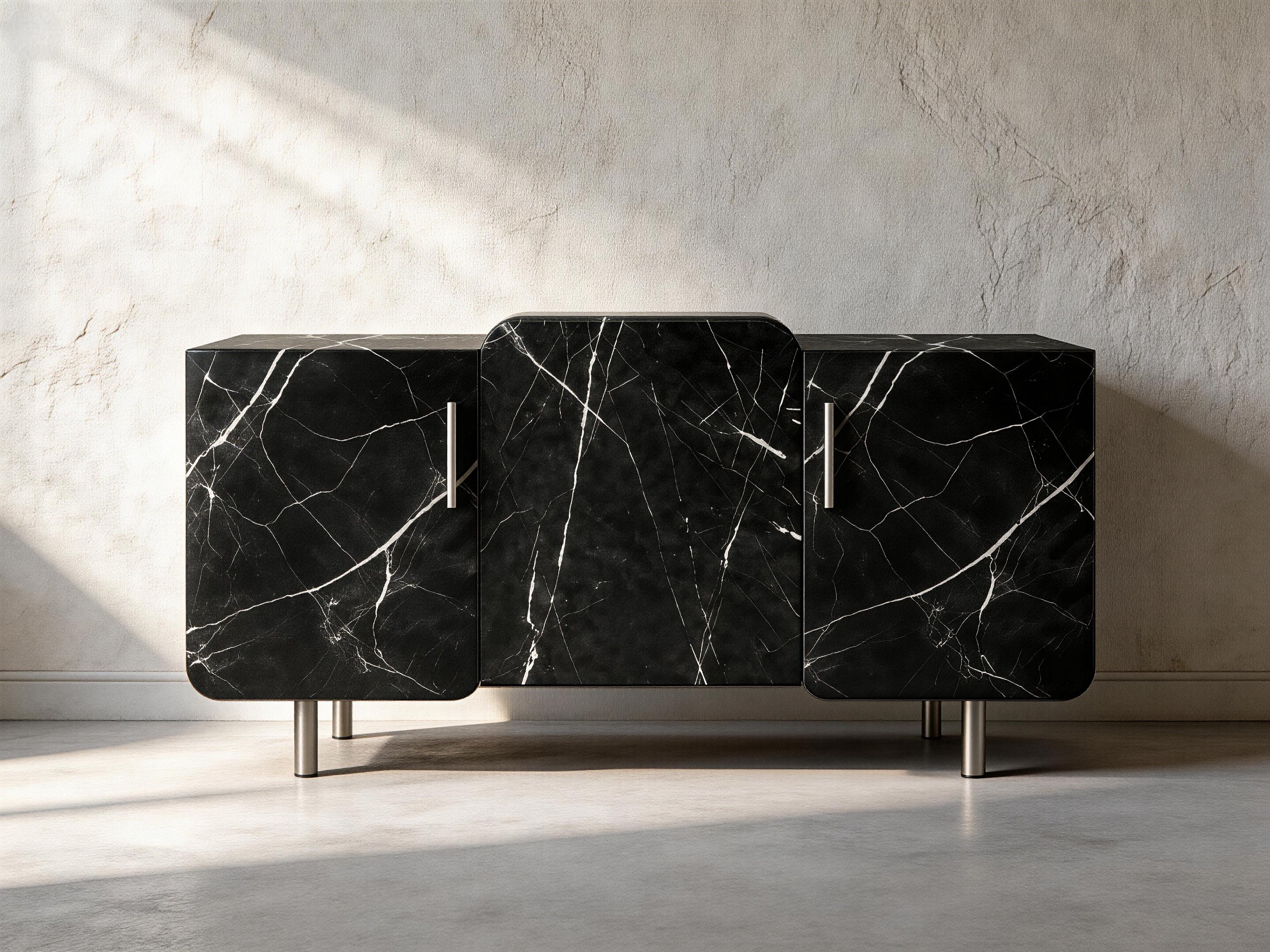 Designerska komoda, która łączy minimalistyczną formę z wyrazistym detalem. Jej charakter definiują miękko zaokrąglone fronty oraz naturalna okleina marmurowa, które nadaje bryle elegancji i rytmu.