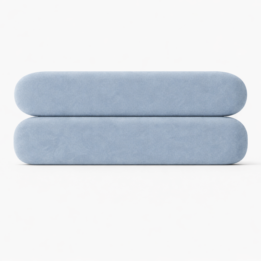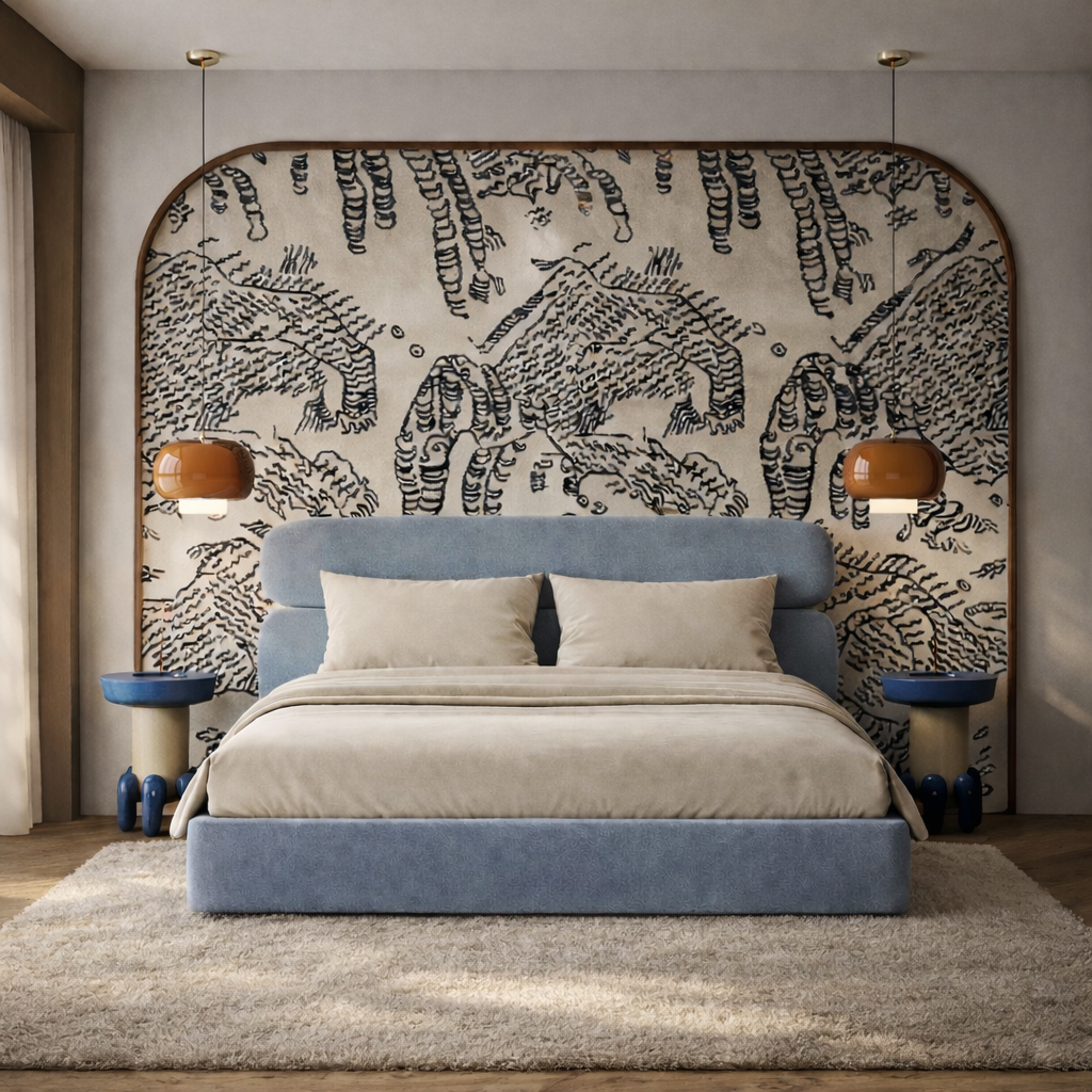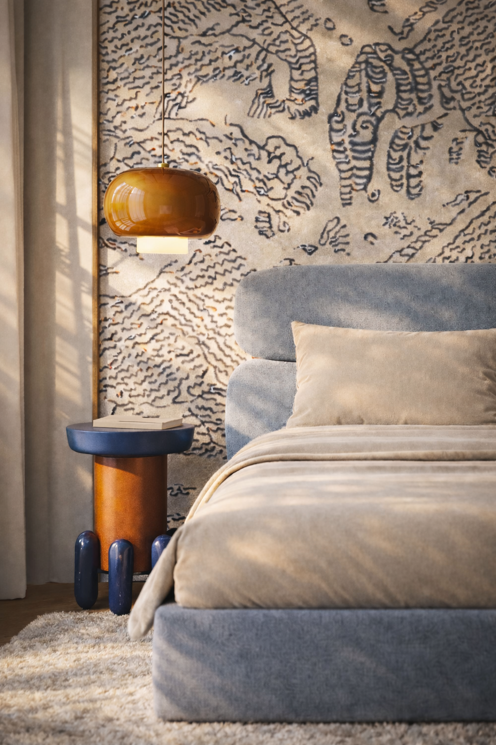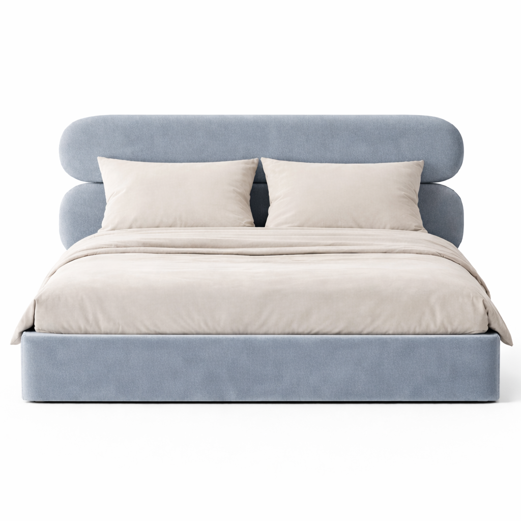 Minimalizm konstrukcji łączy się z miękkością tkaniny, dzięki czemu łóżko staje się centralnym, a jednocześnie subtelnym elementem sypialni.