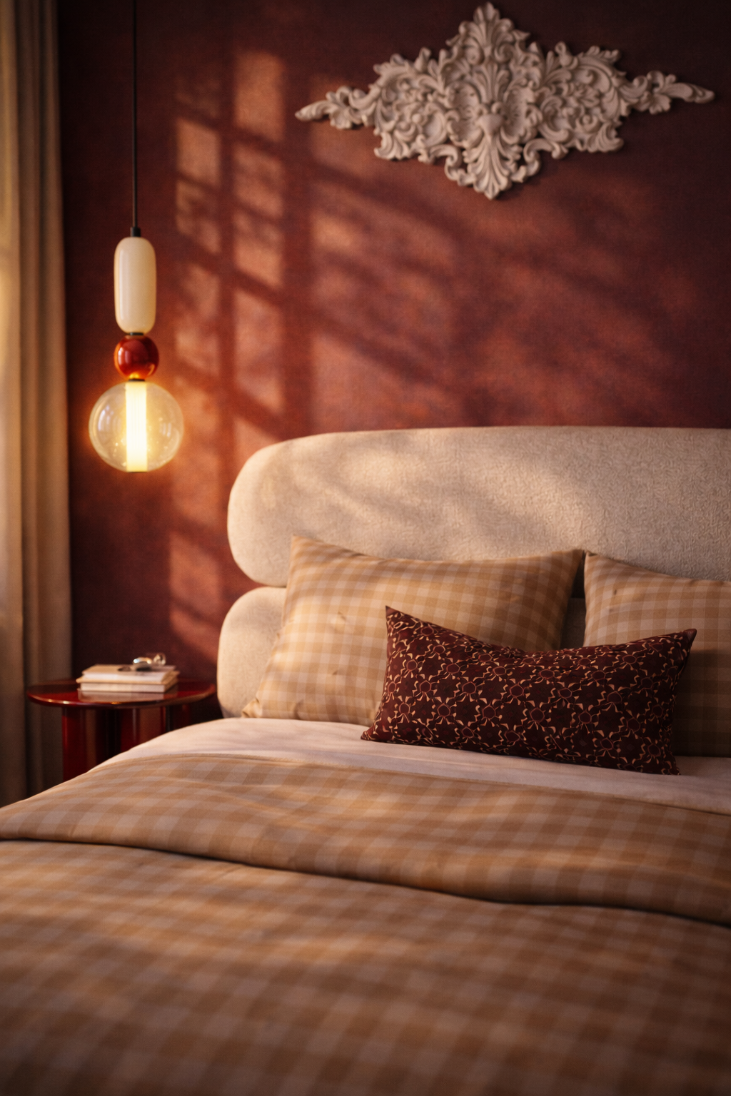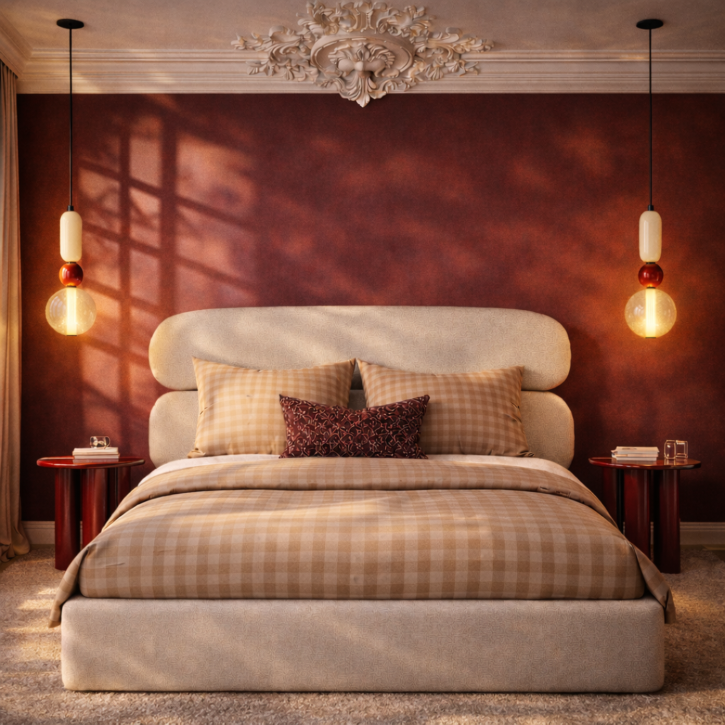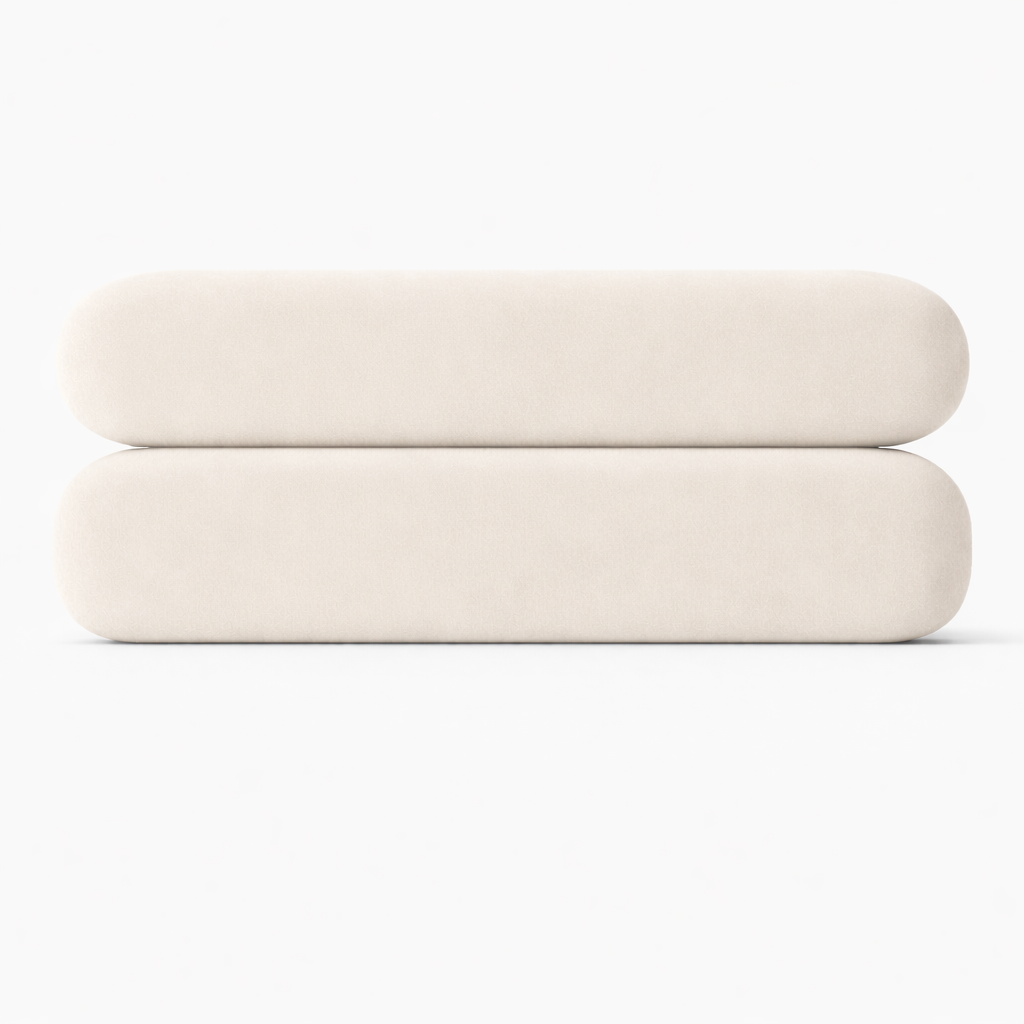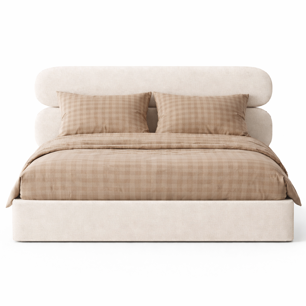 Minimalizm konstrukcji łączy się z miękkością tkaniny, dzięki czemu łóżko staje się centralnym, a jednocześnie subtelnym elementem sypialni.